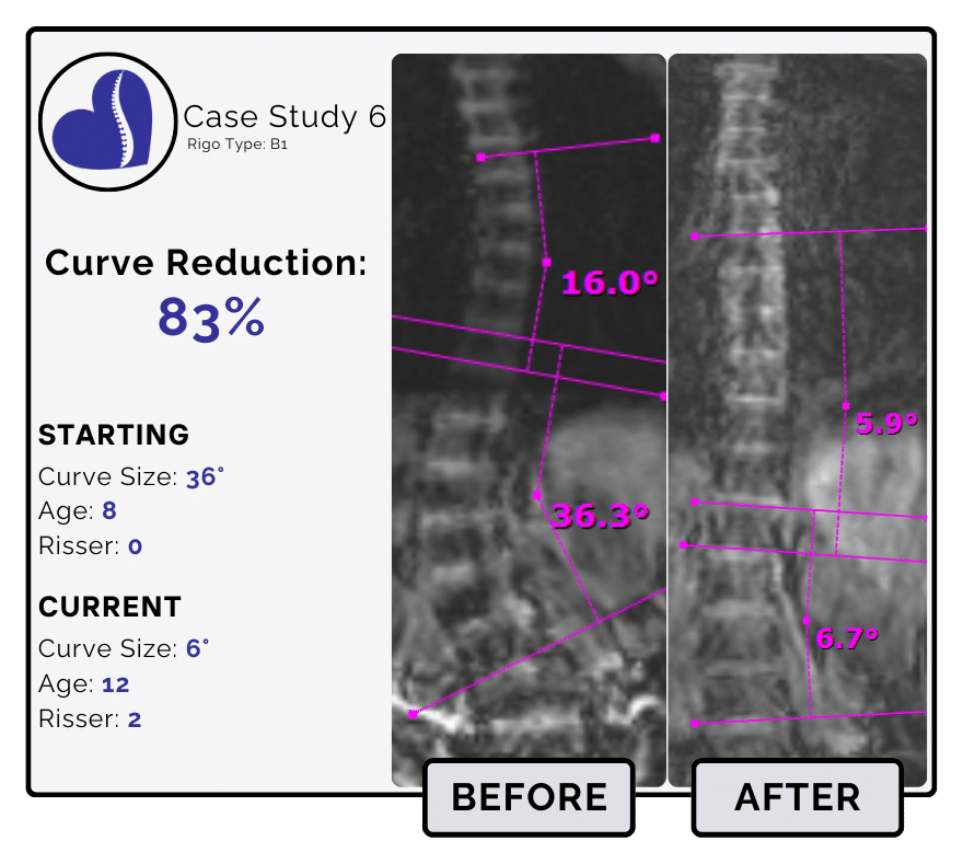 Scoliosis varies in degree and type, which means each case requires a unique approach to treatment. This section outlines the expected success rates, average reductions, and case studies for various curve based on your childs current curve size. This will help you understand the range of treatment results for similar cases.